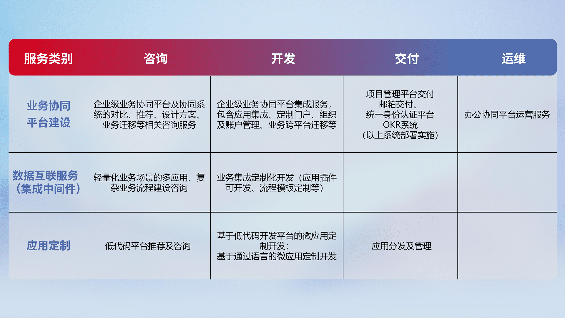 针对钉钉、、、、企微、、、IDaas等平台级产品提供产品的规划、、、方案、、、、交付、、、、定制化开发等服务,,实现如统一协同办公、、智能客户服务、、、、混合会议管理、、、、智能数据查询、、、等业务场景,,实现数字化转型。。。